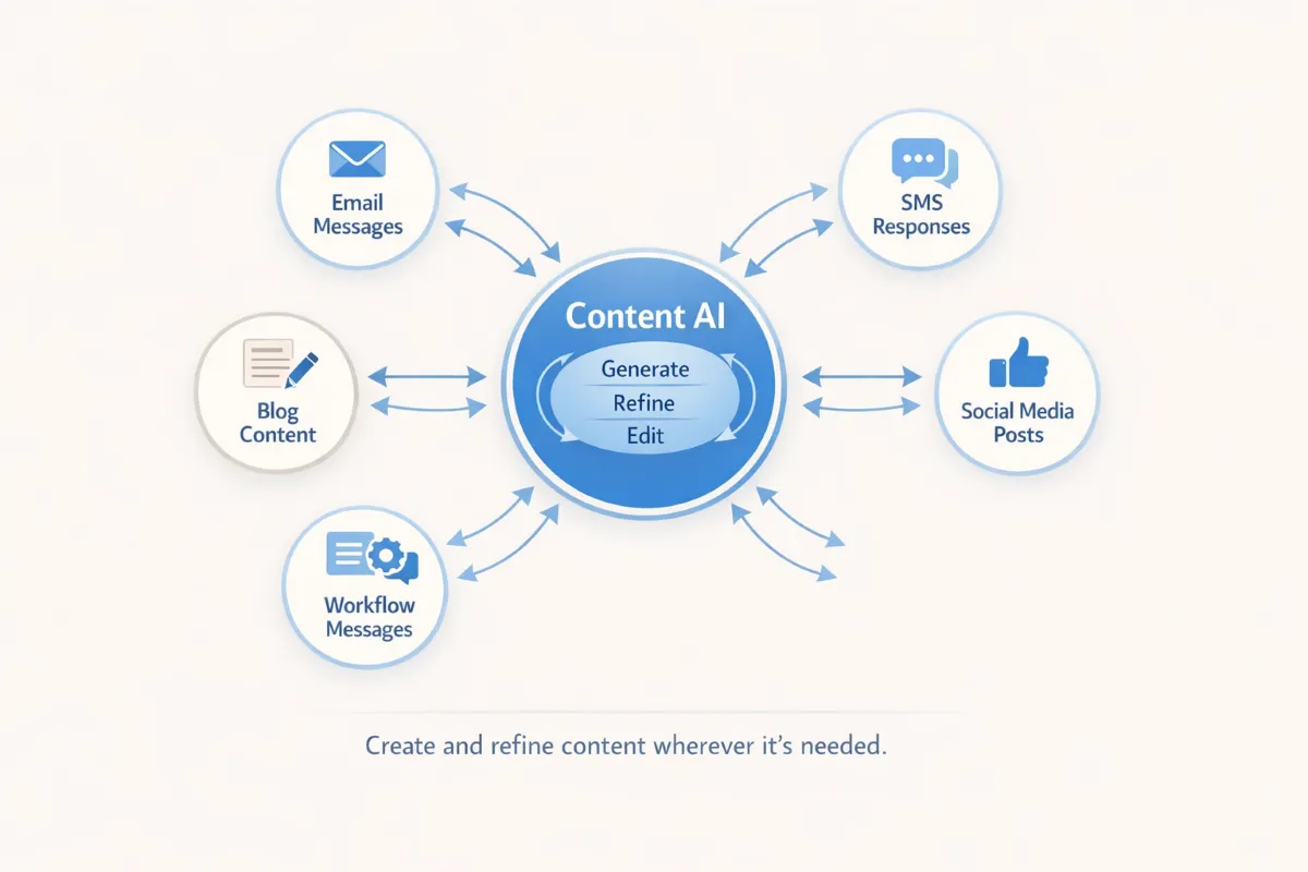 Instead of generating text in an external tool and importing it later, your team can draft, refine, and deploy communication directly inside the platform that manages your contacts, campaigns, and workflows.