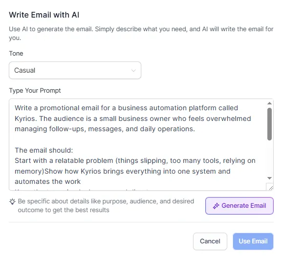 Kyrios is built around a simple principle. The systems that send messages should also be able to help create them. Content AI follows that same idea.