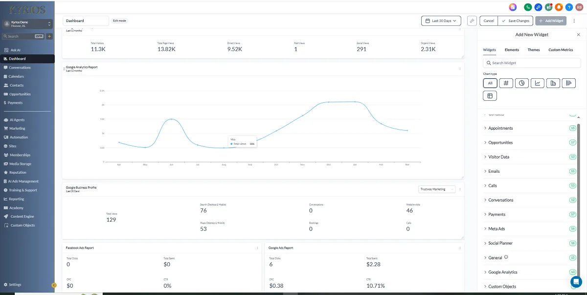 Dashboards pull data directly from system activity across the platform. Because Kyrios connects CRM, pipelines, tasks, communication, and workflows, dashboards reflect real operational movement.