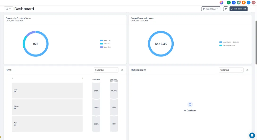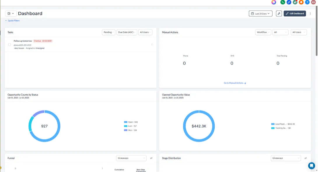 Dashboards show real activity from your CRM, pipelines, tasks, and workflows so you can see movement, workload, and results in one place.