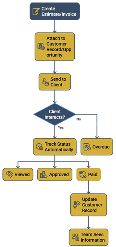 Create estimates, send invoices, and collect payments inside Kyrios so approvals, payment status, and customer records stay connected to deals, workflows, and next steps.