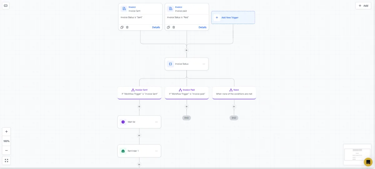 Overdue invoices can trigger reminder messages or internal notifications