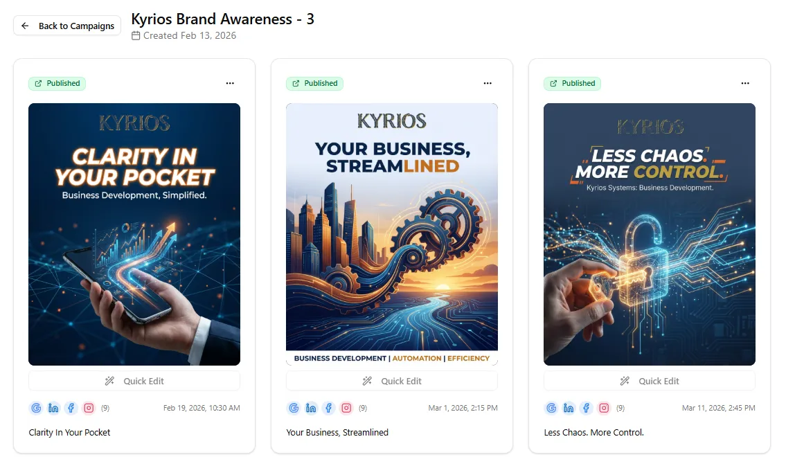 The Social Content Engine gives your business a structured way to generate and manage social content inside Kyrios.