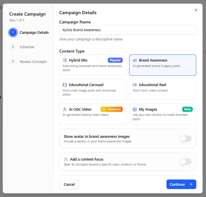 The Social Content Engine can also generate structured campaigns. Instead of creating individual posts, you can generate a coordinated series of posts around a single topic, product, or promotion.