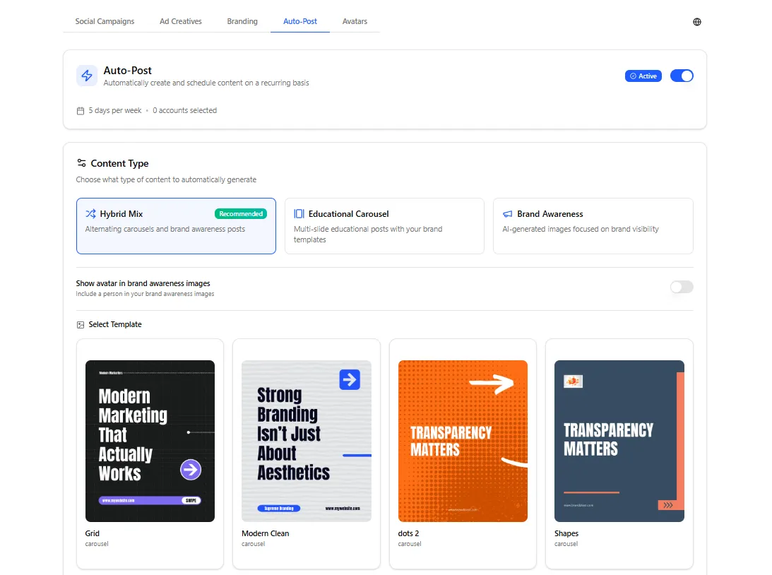 Instead of creating every post manually, the system can generate posts using AI based on the content style and schedule you define.