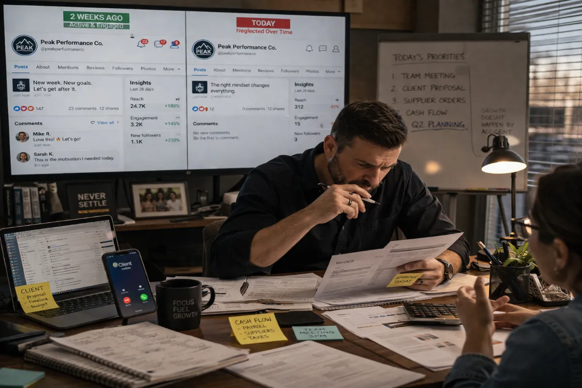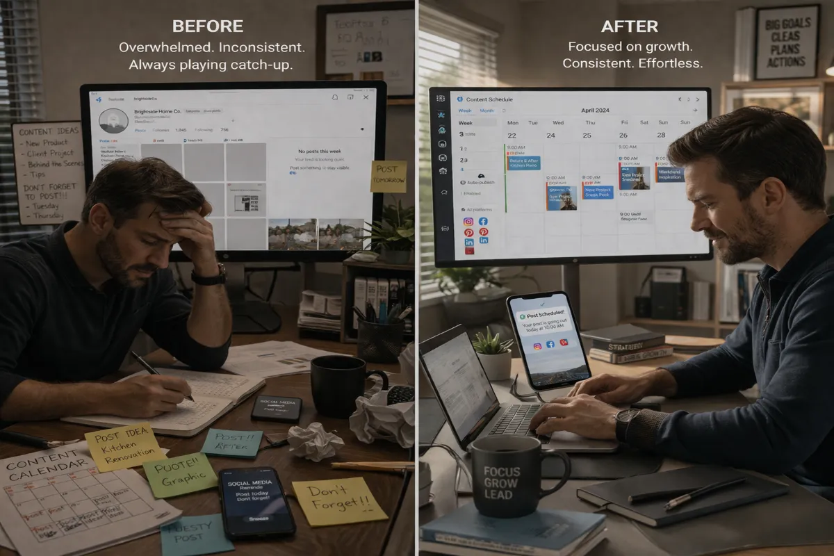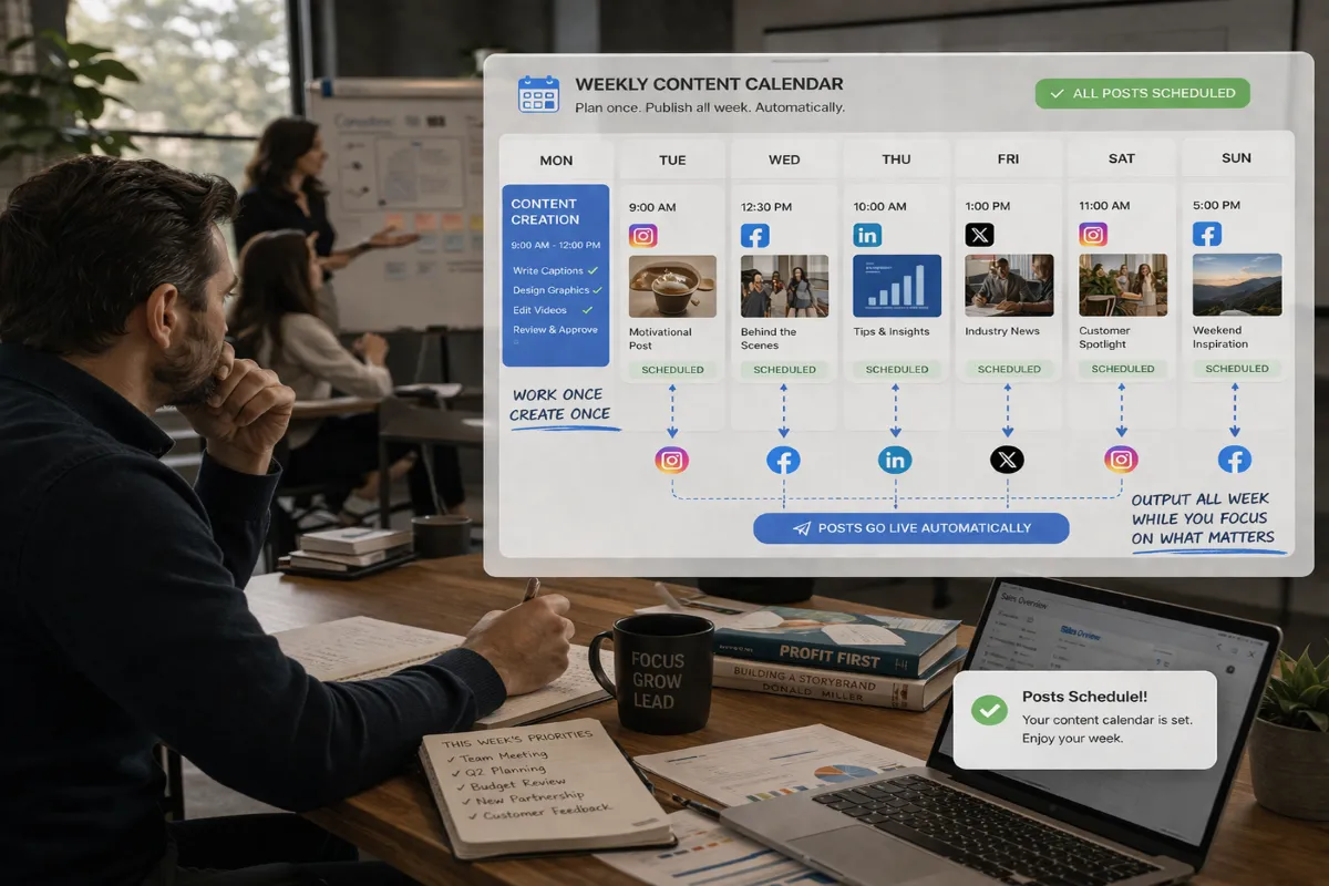 You are trying to keep social media going while also handling customers, sales, operations, and your team. So posting turns into something you do last. Something you rush. Something you skip when time runs out.