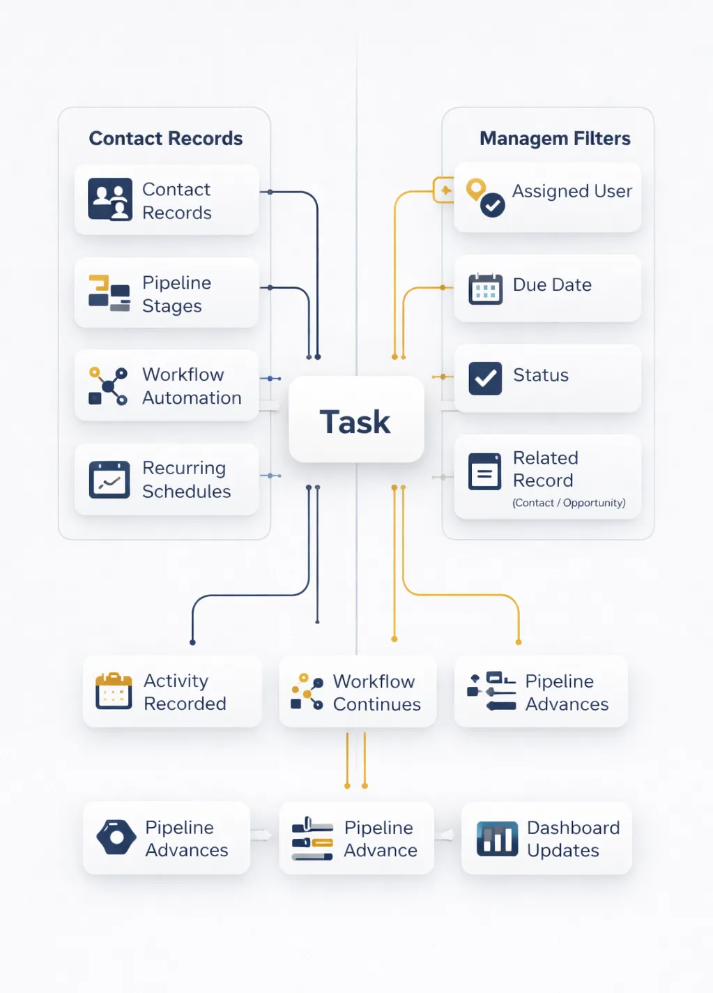 Because tasks connect directly to contacts, pipelines, and workflows, they represent real activity inside the system.