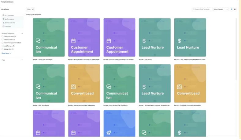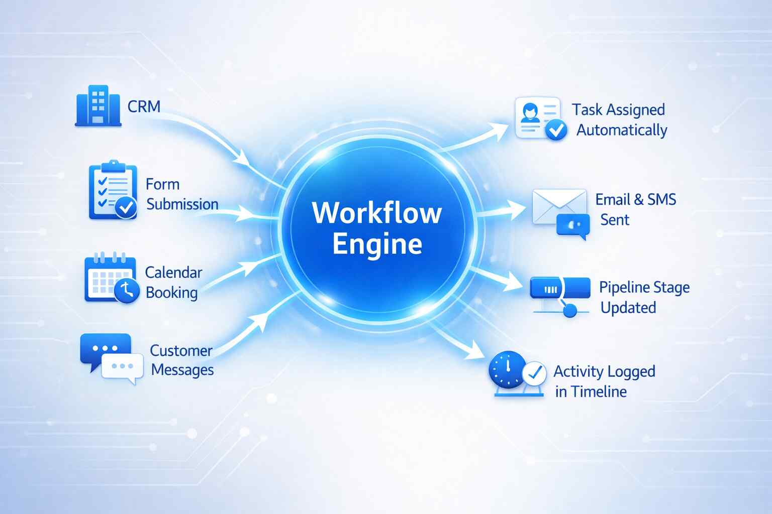 Because communication, CRM, tasks, and pipelines live inside the same platform, workflows can move work forward across all of them.